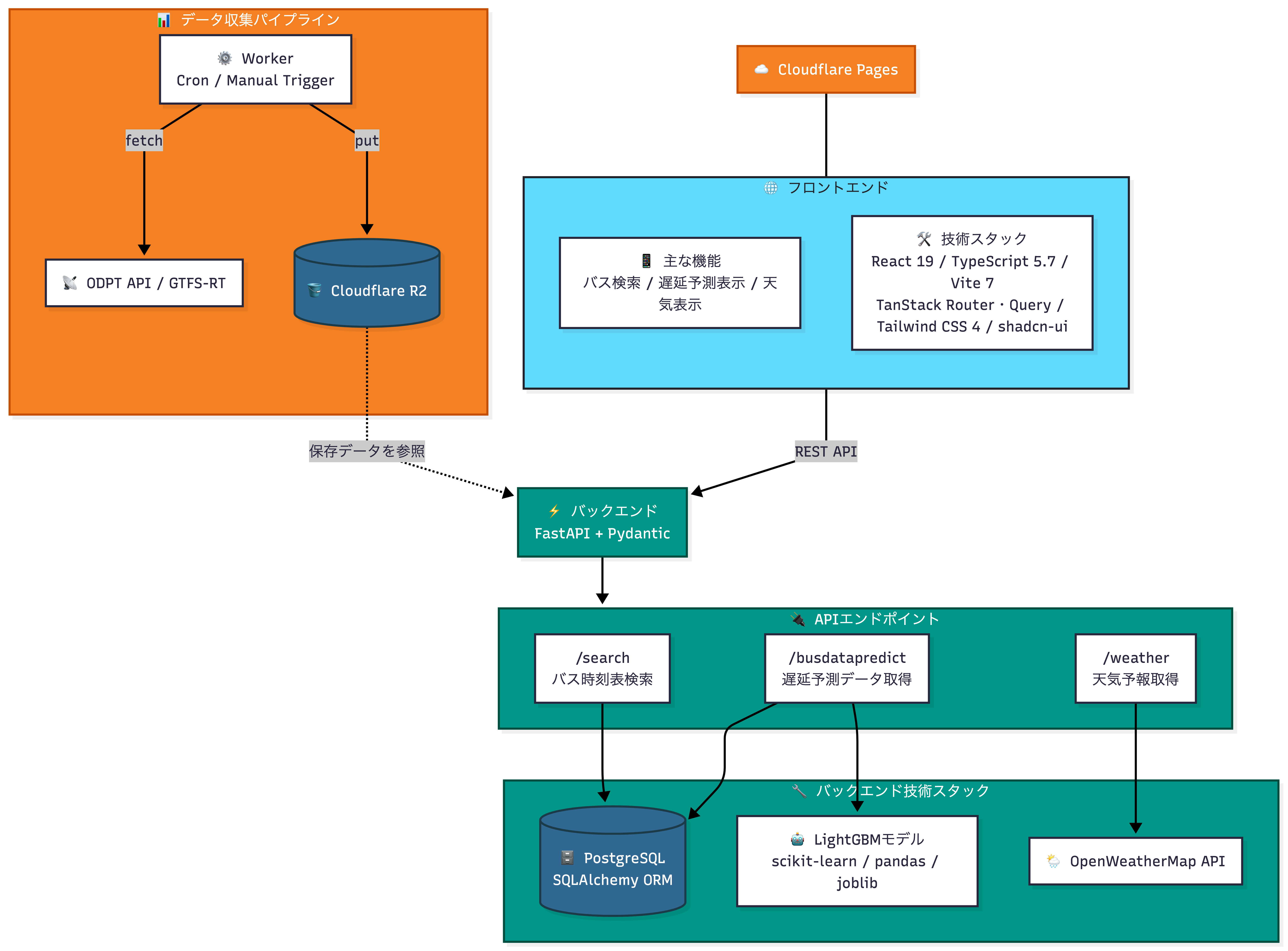本アプリは、公共交通オープンデータセンターが提供する都営バスのリアルタイム位置情報・時刻表データと 気象データを組み合わせ、機械学習で遅延時間を予測するWebアプリケーションです。